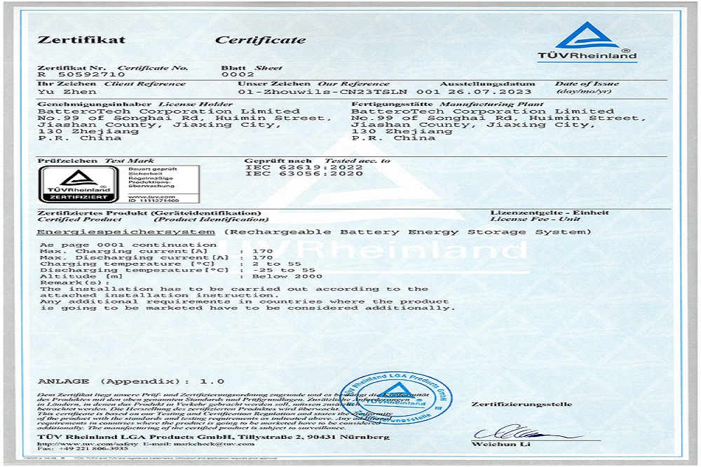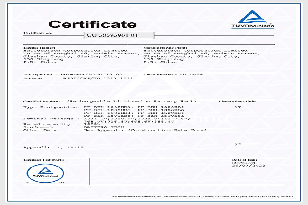 近日,兰钧新能源科技有限公司280Ah风冷插箱、电池簇1000V/1500V双平台储能系统均通过了德国莱茵TÜV Rheinland颁发的IEC 62619、IEC 63056、IEC 62477、IEC 61000、IEC 60730五项国际权威报告及认证,以及UL 1973、UL 9540A两项美标权威认证,这标志着兰钧新能源风冷电池插箱及电池簇在安全性能上已经达到国际标准要求,获得了通往国际市场的通行证。除此之外,该产品也同步取得海关颁发的UN38.3测试报告及配套的运输鉴定,以满足出口运输安全。
