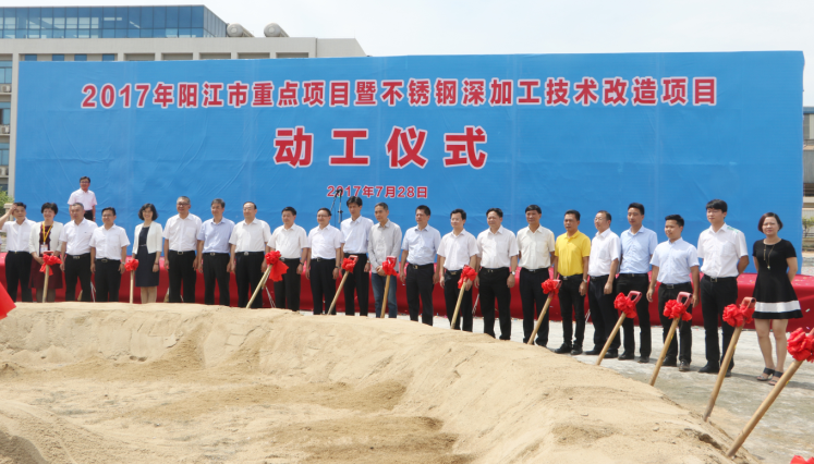 7月28日上午,广东广青金属科技有限公司不锈钢深加工技术改造项目奠基开工仪式在阳江市高新区举行。广东省国资委党委书记、主任李成,副主任刘小龙;阳江市委书记陈小山、市长温湛滨等市领导;广新控股集团董事长黄平、总经理吴晓晖;jinnianhui今年会钢铁董事局主席项光达,青拓集团董事长姜海洪;广青科技董事长林夏苗、总经理何丛珍;珠海对口帮扶阳江指挥部有关负责领导;阳江市相关市直部门、高新区党政主要负责人等领导嘉宾出席开工仪式并为项目动工培土。仪式由阳江副市长张磊主持。