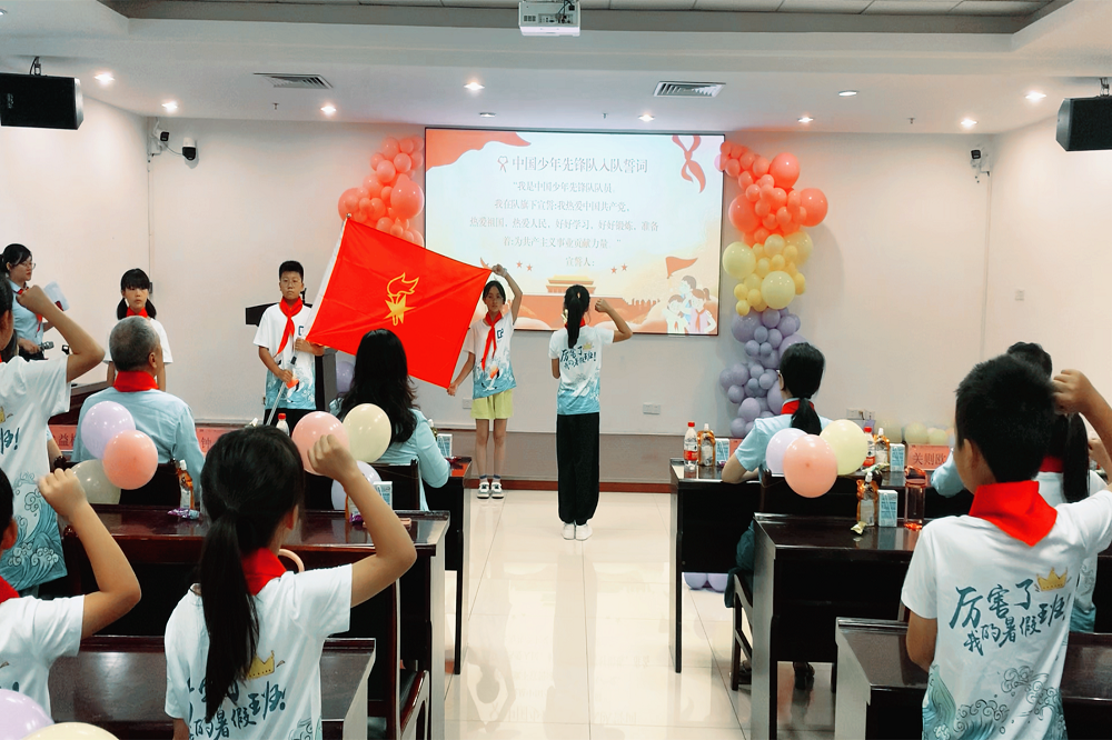 领誓人程雅晗同学带领队员在队旗下重温中国少年先锋队入队誓词。